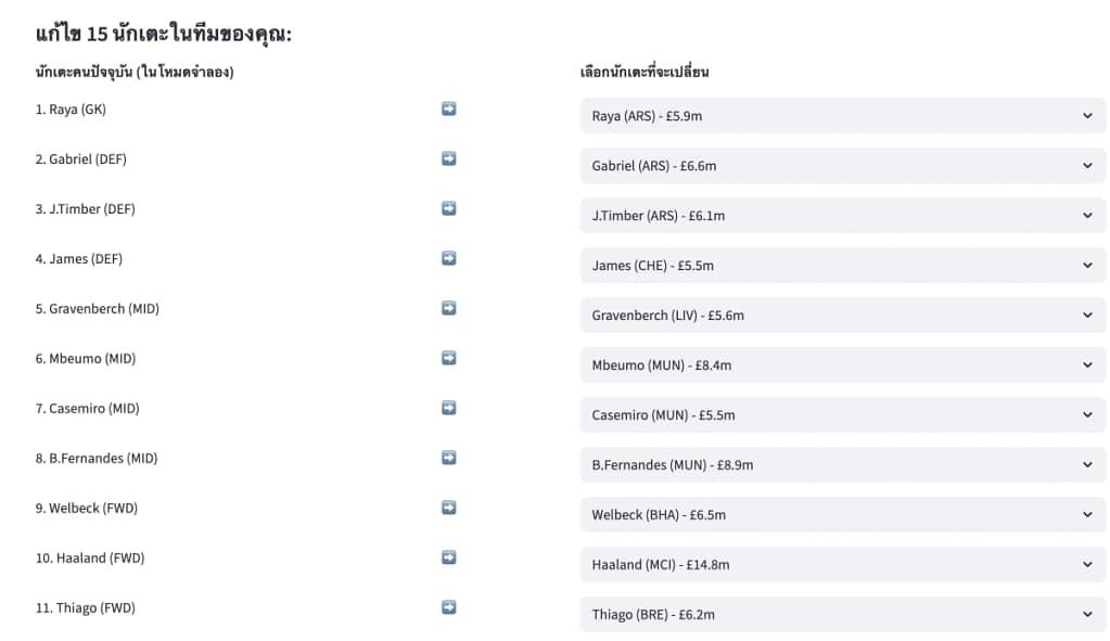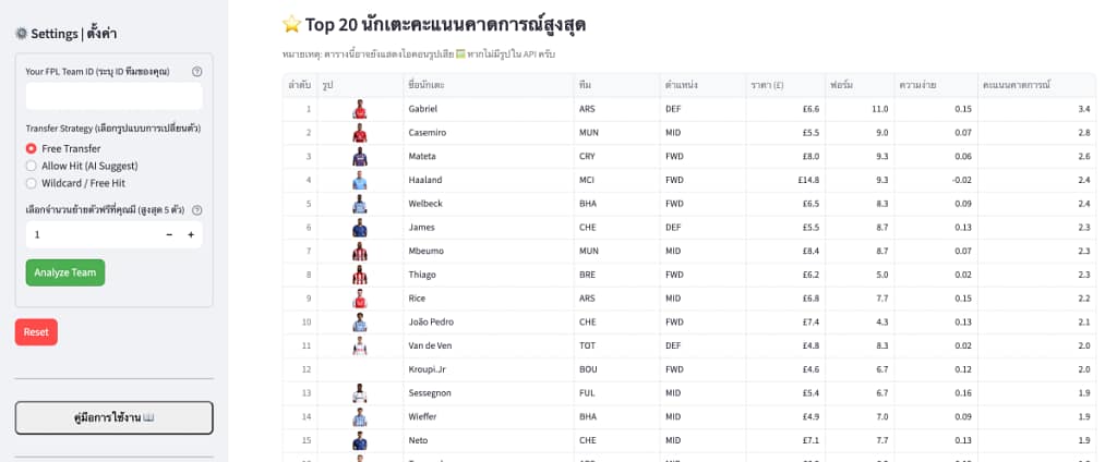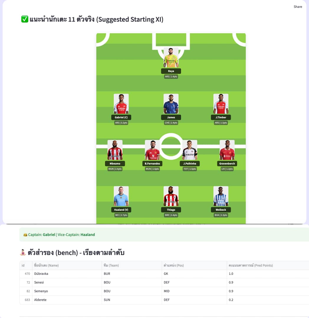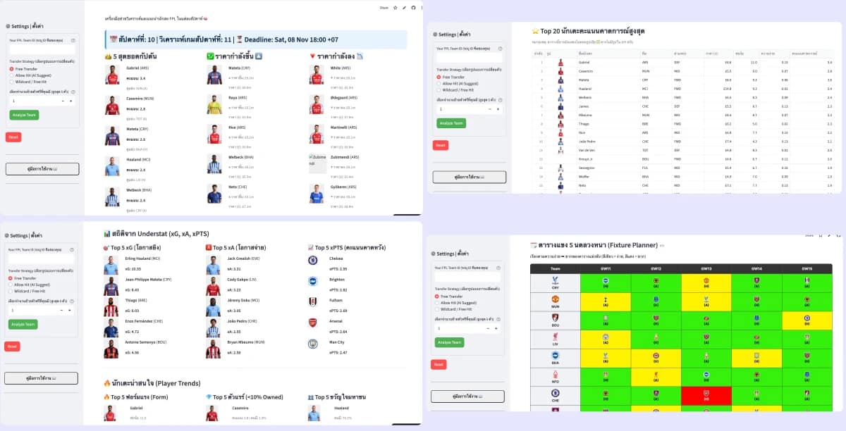การใช้งานเครื่องมือนี้จึงไม่ซับซ้อนเลย เหมาะสำหรับผู้เล่น FPL ที่ต้องการคำแนะนำรวดเร็วและมีเหตุผล โดยไม่ต้องเสียเวลาวิเคราะห์เองให้ปวดหัว