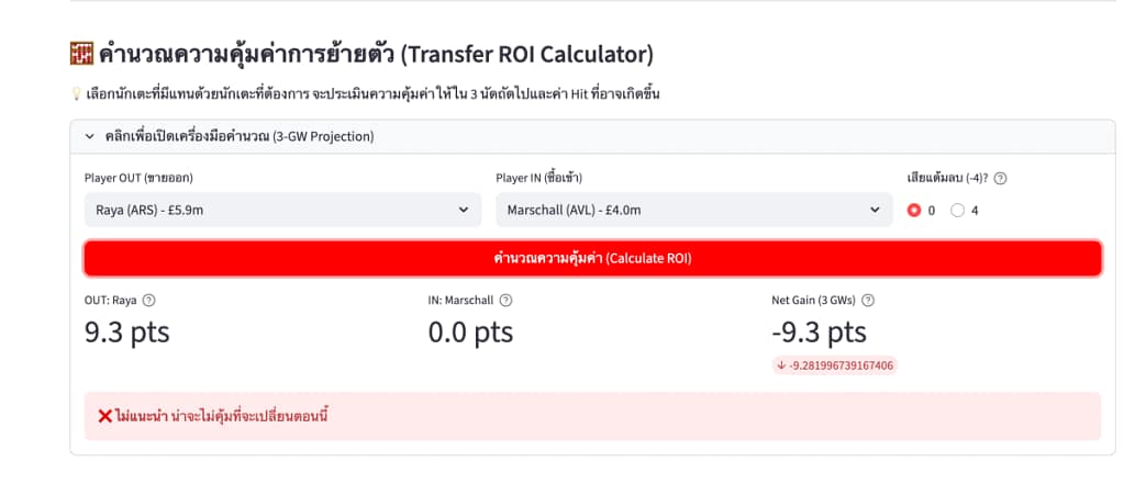 ส่วนที่สองคือ “คำนวณความคุ้มค่าการย้ายตัว (Transfer ROI Calculator)” ที่เป็นเครื่องมือช่วยความคุ้มค่าถ้าเราจะขายนักเตะและซื้อใครมาแทนสักคน โดยระบบจะคำนวณความคุ้มค่าไปถึง 3 นัดข้างหน้า และจะให้คำแนะนำว่าควรขายหรือไม่ โดยสามารถคีย์ชื่อนักเตะได้เลย พิมพ์ 2-3 ตัวอักษรระบบรายชื่ออัตโนมัติก็จะทำงานกรองมาให้ (ไม่ต้องลบชื่อเก่าพิมพ์ทับได้เลย)