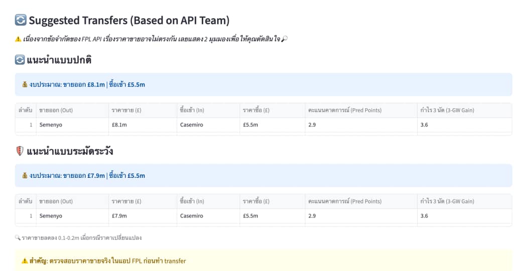ส่วนที่สามคือ “Suggested Transfers” ที่จะแนะนำการเปลี่ยนตัวนักเตะตามกลยุทธ์ที่เราเลือกไว้ ระบบจะแสดงรายละเอียดว่านักเตะคนไหนควรขายออก ใครควรซื้อเข้ามาแทน พร้อมทั้งคำนวณคะแนนสุทธิที่คาดว่าจะได้หรือเสียจากการเปลี่ยนตัวนั้นๆ โดยจะมี “แนะนำปกติ” และ “แนะนำแบบระมัดระวัง” ให้เห็น 2 มุมมอง เนื่องจาก API ที่ได้รับจาก FPL นั้นไม่ได้ส่งค่าราคานักเตะตอนที่เราซื้อไว้ (เพราะมีขึ้นลง) ทำให้เวลาปล่อยขายจริง ราคาอาจไม่ตรงกัน ทั้งนี้ผู้ใช้งานจำเป็นต้องดูราคาขายที่แท้จริงจาก APP PL อีกครั้ง