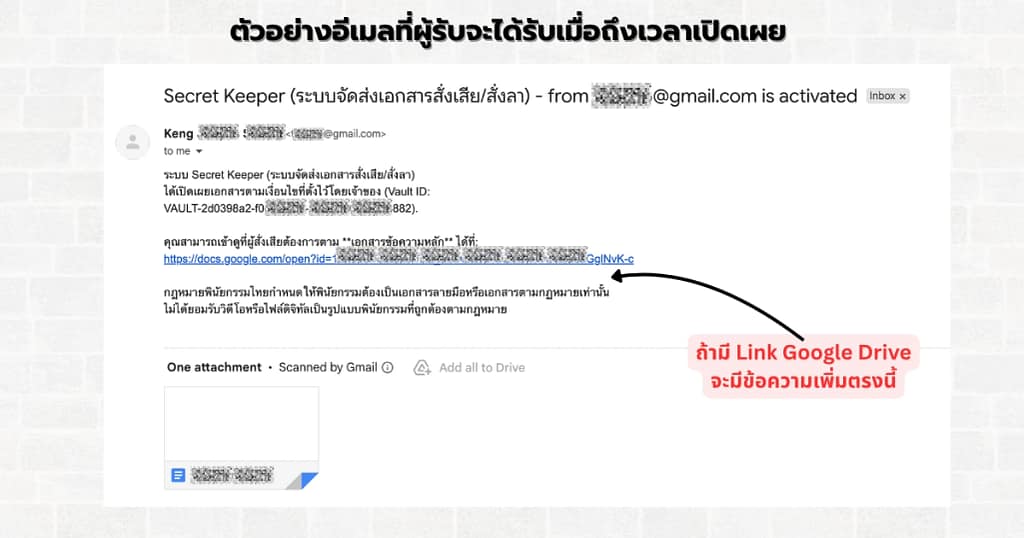 และแม้ว่าระบบจะเปิดเผยความลับไปแล้ว — แต่ก็ยังมีข้อความ LINE OA และ อีเมล ไปยังเจ้าของเอกสารอีกครั้ง เพื่อให้ทราบว่าเอกสารได้ถูกเปิดเผยไปแล้ว ในกรณีเกิดข้อผิดพลาดโดยไม่ตั้งใจ เช่น ลืมเช็กอิน เจ้าของเอกสารยังสามารถไปยับยั้งโดยยกเลิกการแชร์ Google Docs และ Google Drive หรือลบเอกสารได้ เอกสารก็ยังไม่ถูกเปิดเผย หากสามารถแก้ไขได้ทันเวลาก่อนผู้รับเปิดอ่าน
