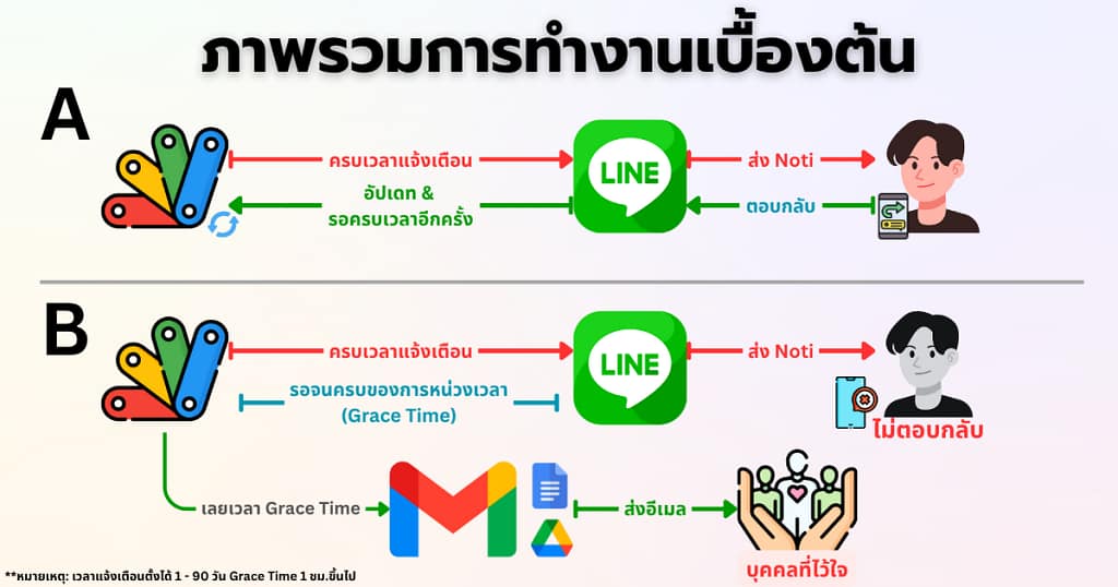- หากเลยกำหนดและพ้นช่วง “Grace time”(ระยะเวลาผ่อนผัน) แล้วไม่เช็กอิน → ระบบจะถือว่าเจ้าของบัญชี “ไม่อยู่แล้ว”
