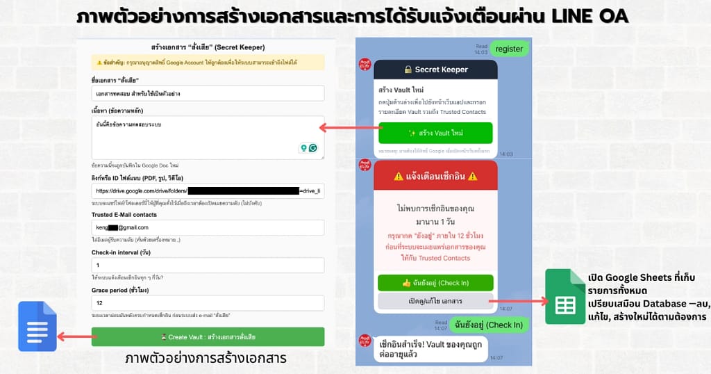 ระบบจะทำการแจ้งเตือนไปยังเจ้าของ Vault ผ่าน LINE OA พร้อมกันกับ อีเมล (Gmail) โดยอัตโนมัติ การดำเนินการนี้มีจุดประสงค์เพื่อให้มั่นใจได้ว่าเจ้าของ Vault จะได้รับลิงก์สำหรับ Check-in ฉุกเฉินอย่างแน่นอน ไม่ว่าช่องทาง LINE จะขัดข้องหรือมีปัญหาชั่วคราวก็ตาม ซึ่งช่วยให้การทำงานของระบบยังคงต่อเนื่องและเพิ่มความน่าเชื่อถือในการยืนยันตัวตนก่อนการเปิดเผยความลับ