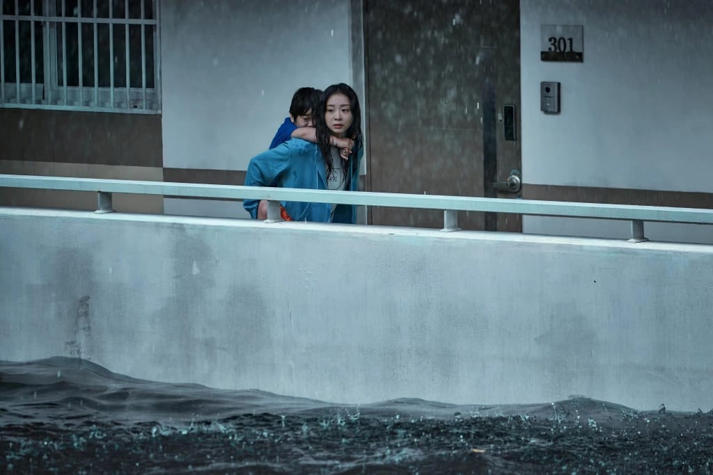 ในชั่วโมงแรก The Great Flood วางตัวเองอย่างมั่นคงในขนบของหนังเอาตัวรอดจากภัยพิบัติ น้ำท่วมโลกที่ไหลบ่าอย่างไร้ความปรานี อาคารสูงที่ค่อย ๆ กลืนกินผู้คน ความโกลาหลของมนุษย์ที่ต้องเลือกว่าจะช่วยใครหรือรักษาชีวิตตัวเองไว้ก่อน ตัวหนังทำให้เรานึกถึงหนังภัยพิบัติเกาหลีร่วมสมัยที่เชี่ยวชาญการสร้างแรงกดดันแบบ “สถานการณ์บีบคั้น” ได้ดีเยี่ยม ฉากน้ำซัด น้ำทะลัก และการเคลื่อนกล้องในพื้นที่แคบ ๆ ทำให้ผู้ชมรู้สึกเหมือนติดอยู่ในตึกนั้นจริง ๆ