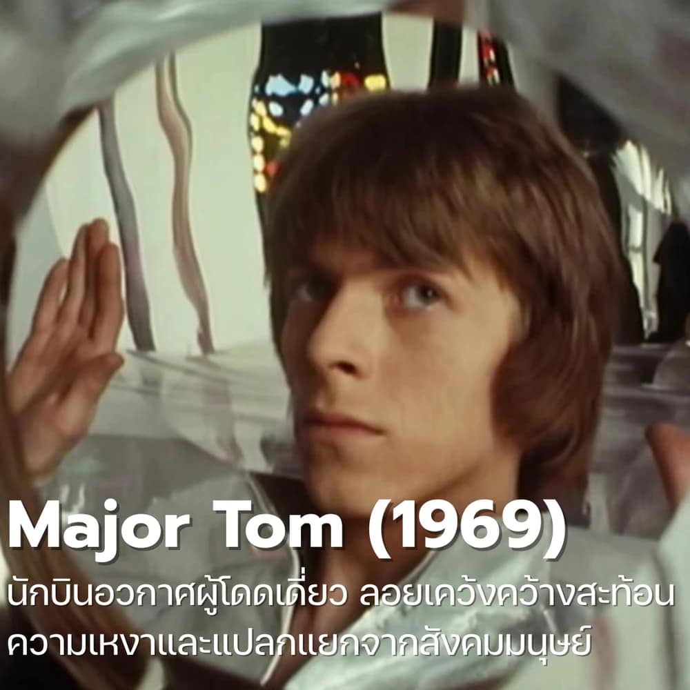 จุดเริ่มต้นการเดินทางเหนือจินตนาการ Major Tom ปรากฏตัวครั้งแรกในเพลง Space Oddity ซึ่งถูกปล่อยออกมาในช่วงเวลาเดียวกับที่ภารกิจอพอลโล 11 กำลังจะไปเหยียบดวงจันทร์ เขามาพร้อมภาพลักษณ์นักบินอวกาศผู้โดดเดี่ยวที่ตัดสินใจตัดขาดการสื่อสารกับศูนย์ควบคุม และปล่อยให้ตัวเองล่องลอยไปในความเวิ้งว้างของจักรวาลอย่างไม่มีวันกลับ ตัวละครนี้สะท้อนความรู้สึกแปลกแยกจากสังคมมนุษย์ เป็นภาพแทนของความเหงาและการหลีกหนีจากโลกความเป็นจริงที่วุ่นวาย ความรู้สึกโดดเดี่ยวที่งดงามนี้เข้าถึงส่วนลึกในใจของคนฟังได้อย่างประหลาด และ Major Tom ยังถูก Bowie นำกลับมาใช้เล่าเรื่องราวในเพลงยุคหลังๆ อีกหลายครั้ง เปรียบเสมือนตัวแทนการเดินทางของชีวิตเขาเอง