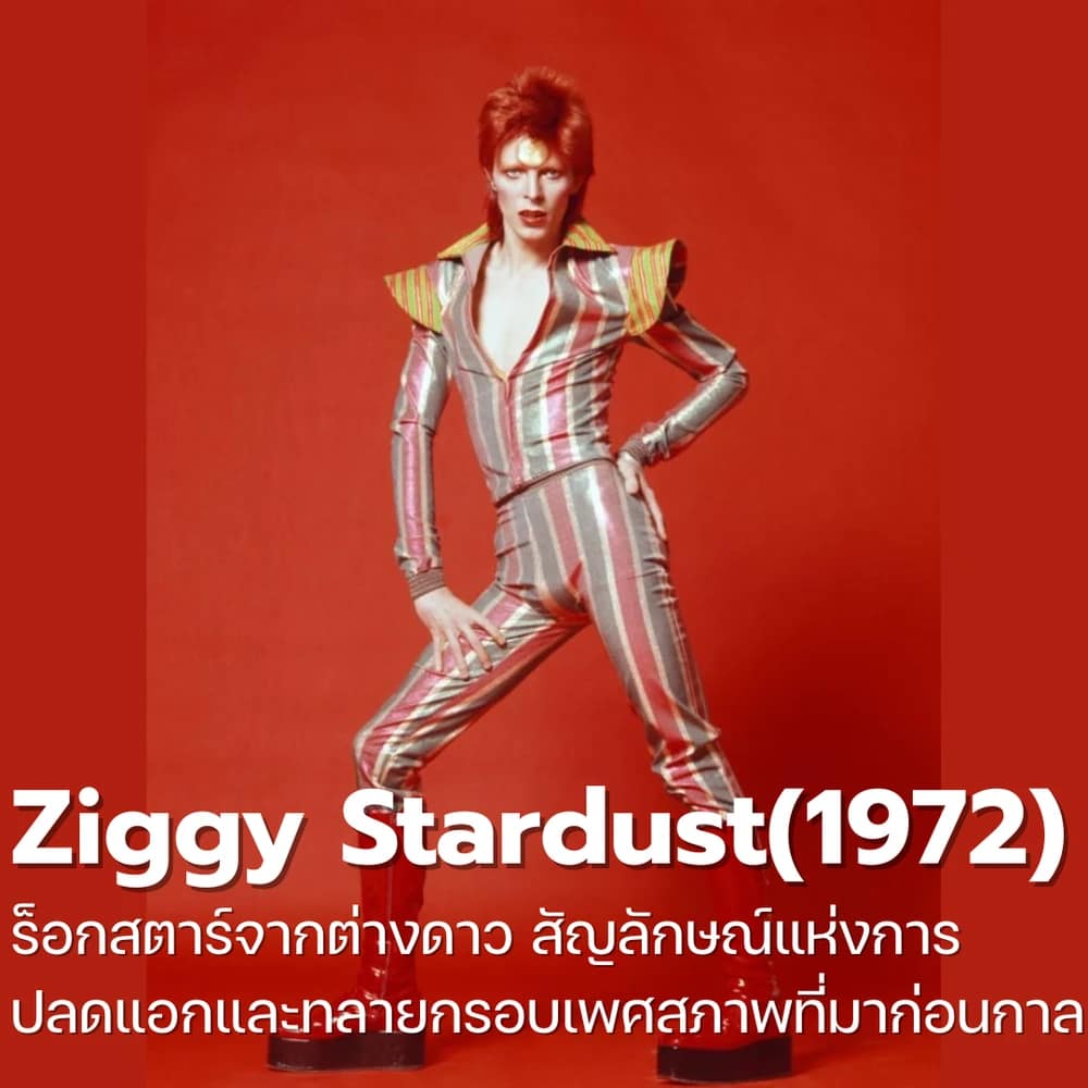 คาแรคเตอร์ที่สร้างแรงสั่นสะเทือนและทำให้เขาก้าวขึ้นเป็นซูเปอร์สตาร์ระดับโลก Ziggy Stardust คือมนุษย์ต่างดาวร็อกสตาร์ผู้มีสไตล์กึ่งหญิงกึ่งชาย (Androgyny) ที่ถูกส่งมาเพื่อส่งสารเตือนถึงวันสิ้นโลก คาแรคเตอร์นี้โดดเด่นด้วยผมสีแดงเพลิง การแต่งหน้าสไตล์คาบูกิ และแฟชั่นจัดจ้าน ซึ่งไม่เพียงแต่สร้างปรากฏการณ์ทางดนตรี แต่ยังเป็นสัญลักษณ์แห่งการปลดแอกให้วัยรุ่นยุค 70s กล้าลุกขึ้นมาแสดงออกถึงตัวตนอย่างเสรี ความสำเร็จของ Ziggy นั้นยิ่งใหญ่จนเส้นแบ่งระหว่างตัวละครและตัวตนจริงของ Bowie เริ่มเลือนราง เขาอินกับบทบาทนี้อย่างหนักจนส่งผลกระทบต่อสภาพจิตใจ ในที่สุดเขาจึงตัดสินใจ “ฆ่า” คาแรคเตอร์นี้ทิ้งด้วยการประกาศยุติบทบาทกลางเวทีคอนเสิร์ตในปี 1973 ทิ้งไว้เพียงตำนานของศาสดาแห่งความลื่นไหลทางเพศที่ยังคงทรงอิทธิพลมาจนถึงปัจจุบัน