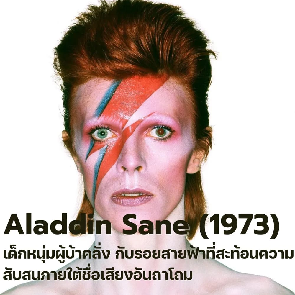 Aladdin Sane หรือที่มาจากการเล่นคำว่า “A Lad Insane” (เด็กหนุ่มผู้บ้าคลั่ง) คือวิวัฒนาการต่อยอดจาก Ziggy หลังจากที่ Bowie ได้สัมผัสกับคลื่นความโด่งดังที่ถาโถมเข้าใส่ระหว่างการทัวร์สหรัฐอเมริกา คาแรคเตอร์นี้จึงเปรียบเสมือนภาพสะท้อนของซูเปอร์สตาร์ที่เบื้องหน้าดูสวยงามล้ำยุค แต่เบื้องหลังกลับเต็มไปด้วยความสับสน อ้างว้าง และหวาดระแวงจากชื่อเสียงที่ได้รับ รอยเพนต์สายฟ้าฟาดบนใบหน้าอันเป็นภาพจำตลอดกาล ไม่ได้เป็นเพียงแค่แฟชั่น แต่เป็นสัญลักษณ์ที่สื่อถึง “จิตใจที่ถูกแบ่งแยกและแตกสลาย” ซึ่งส่วนหนึ่งได้รับแรงบันดาลใจมาจากพี่ชายของเขาที่ป่วยเป็นโรคจิตเภท คาแรคเตอร์นี้จึงเป็นตัวแทนของความขัดแย้งในตัวเอง ที่ถูกถ่ายทอดผ่านดนตรีร็อกผสมกลิ่นอายแจ๊สที่ดูบ้าคลั่งและไร้ทิศทาง