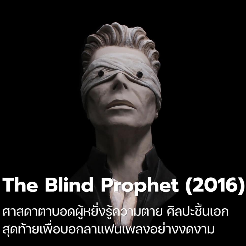 มรดกชิ้นสุดท้ายที่เขาทิ้งไว้ให้โลกใบนี้ The Blind Prophet ปรากฏตัวในมิวสิกวิดีโอเพลง Blackstar และ Lazarus ซึ่งถูกปล่อยออกมาก่อนที่เขาจะเสียชีวิตเพียงไม่กี่วัน คาแรคเตอร์นี้มาในภาพลักษณ์ของชายชราที่มีผ้าพันแผลปิดตาทั้งสองข้างและใช้กระดุมสีดำแทนดวงตา สื่อถึงผู้ที่แม้มองไม่เห็นโลกภายนอกแล้ว แต่กลับมีญาณหยั่งรู้ถึงวาระสุดท้ายของตัวเองอย่างถ่องแท้ นี่คือวิธีที่ Bowie ใช้เผชิญหน้ากับความตายอย่างกล้าหาญที่สุด เขาปกปิดอาการป่วยเป็นโรคมะเร็งจากสาธารณชน และเลือกที่จะเปลี่ยนความเจ็บปวดให้กลายเป็นผลงานศิลปะชิ้นเอกเพื่อบอกเล่าการเดินทางครั้งสุดท้าย The Blind Prophet จึงไม่ใช่แค่คาแรคเตอร์สมมติ แต่คือบทสรุปอันงดงามที่แสดงให้เห็นว่าเขาคือศิลปินที่อุทิศตัวเพื่องานศิลปะจนลมหายใจสุดท้าย