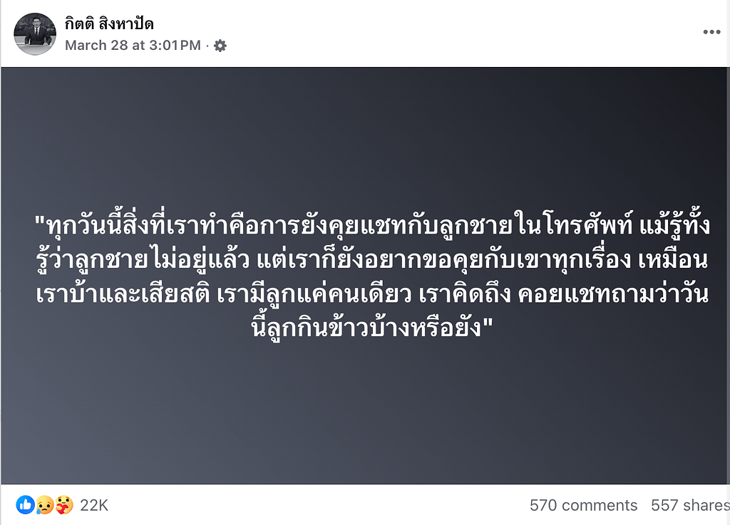 “ทุกวันนี้สิ่งที่เราทำ คือการยังคุยแชทกับลูกชายในโทรศัพท์ แม้รู้ทั้งรู้ว่าลูกชายไม่อยู่แล้ว แต่เราก็ยังอยากขอคุยกับเขาทุกเรื่อง… คอยแชทถามว่าวันนี้ลูกกินข้าวบ้างหรือยัง คนอื่นอาจมองว่าเราเป็นบ้าไปแล้ว แต่นี่เป็นสิ่งเดียวที่พอทำได้”